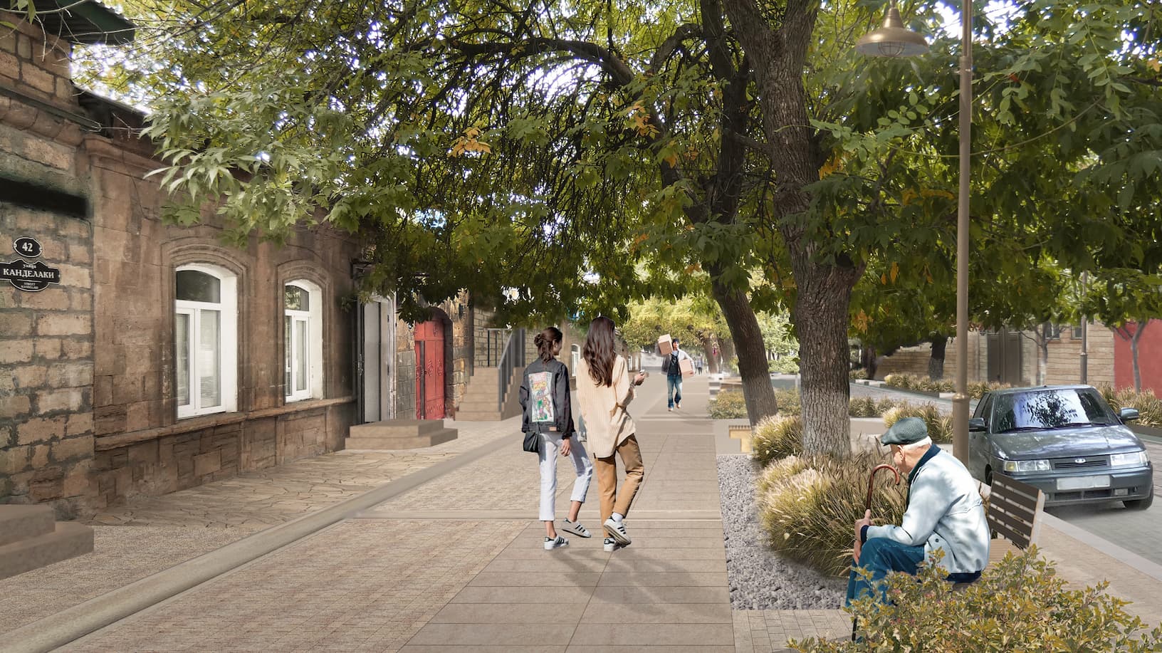 Из заставленной машинами улицы, Канделаки преобразится в прогулочный зеленый бульвар из рукельского известняка. Так проектом подчеркивается центральное положение и история улицы 19-го века.