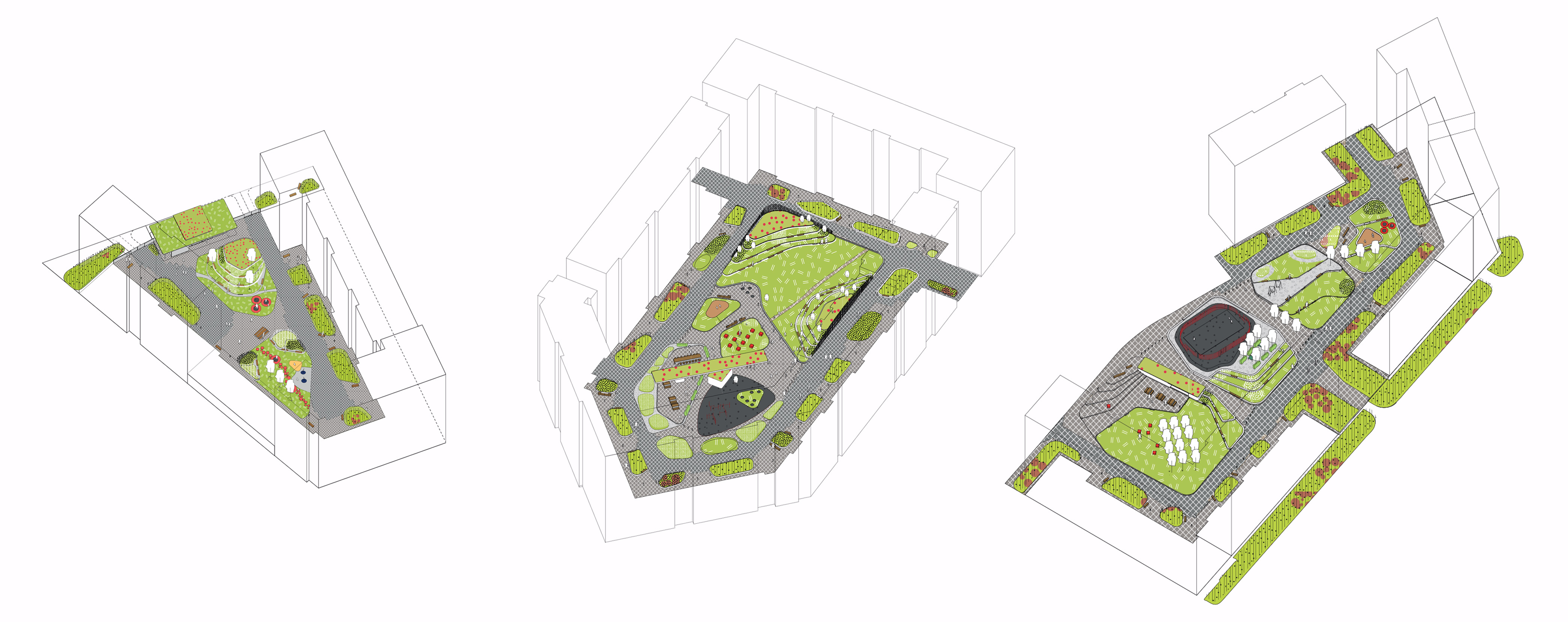 Принципы и смыслы интегрируются в проекты всех типов открытых городских пространств. На примере концепций D12, D13, D19-21 проиллюстрированы дизайн-решения дворовых пространств жилого района Скандинавия А101.