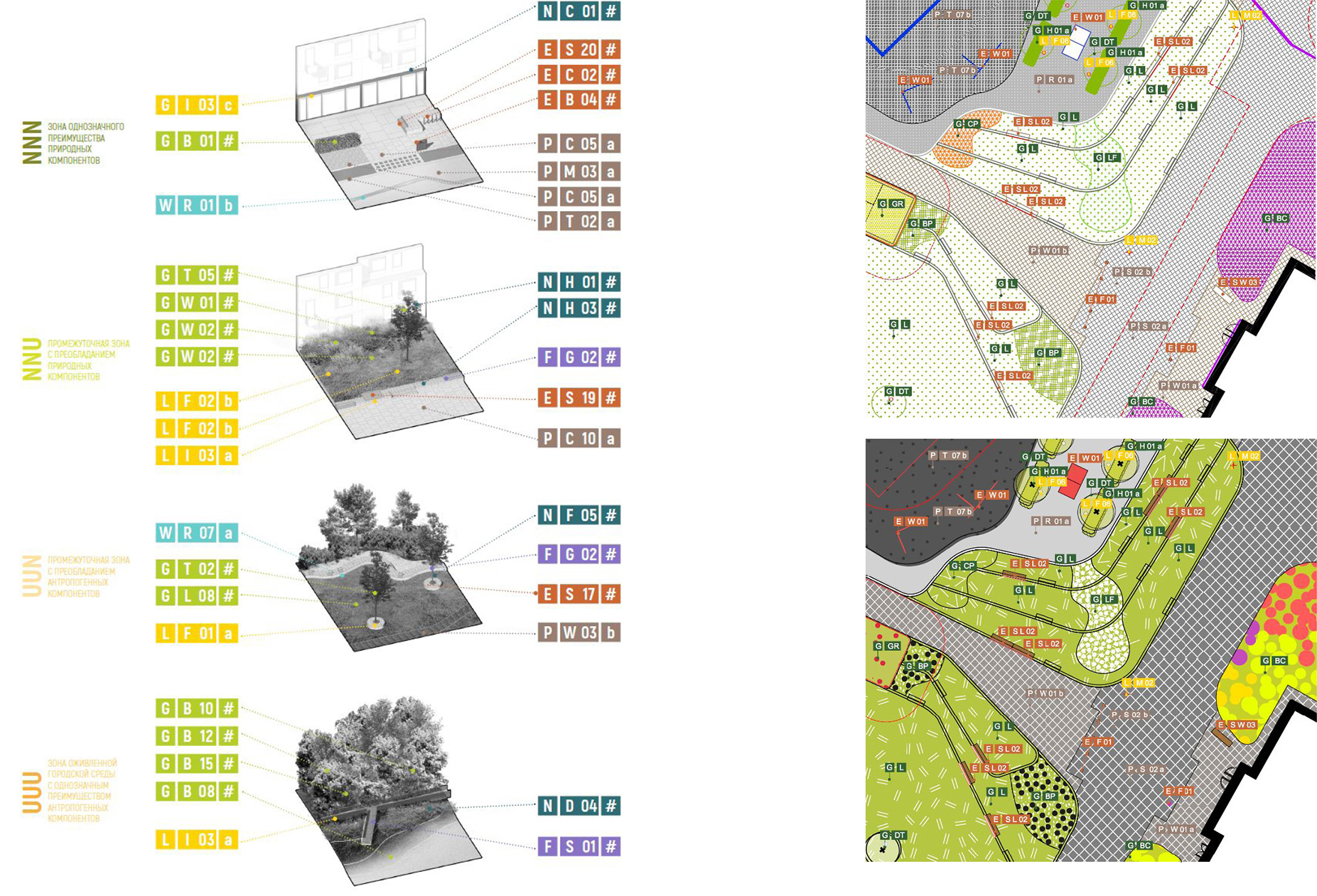 Дизайн-код открытых городских пространств - каталог дизайн-решений, применяемых в проекте. Дизайн-код необходим в проектах масштаба жилого района, т.к. позволяет перейти от множества частных дизайн-решений к использованию типовых решений в рамках одного проекта с соблюдением цельности и общего характера решений, определенного в Концепции открытых городских пространств жилого района Скандинавия А101